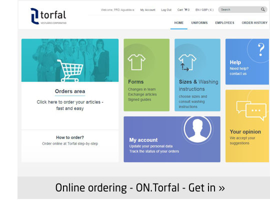 Torfal has in its service portfolio a online ordering platform –ON.Torfal. This plataform turns ordering into an easy, comfortable and fast process, offering a closer and mores efficient service.Clients will be able to swiftly follow their orders and access to activity reports, simplifying their buying process either for stock of for each of their employees – 24 / 7.