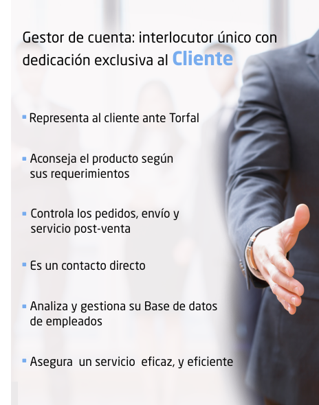 En Torfal a cada cliente se valora individualmente y se le asigna gestor de cuenta dedicado que representa los intereses del cliente dentro de nuestra organización.Nuestro experimentado equipo de gestores de cuentas es experto en todas nuestras áreas de trabajo, así como en la planificación de proyectos pequeños y grandes, tanto a nivel nacional como internacional.
